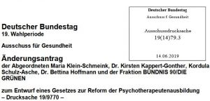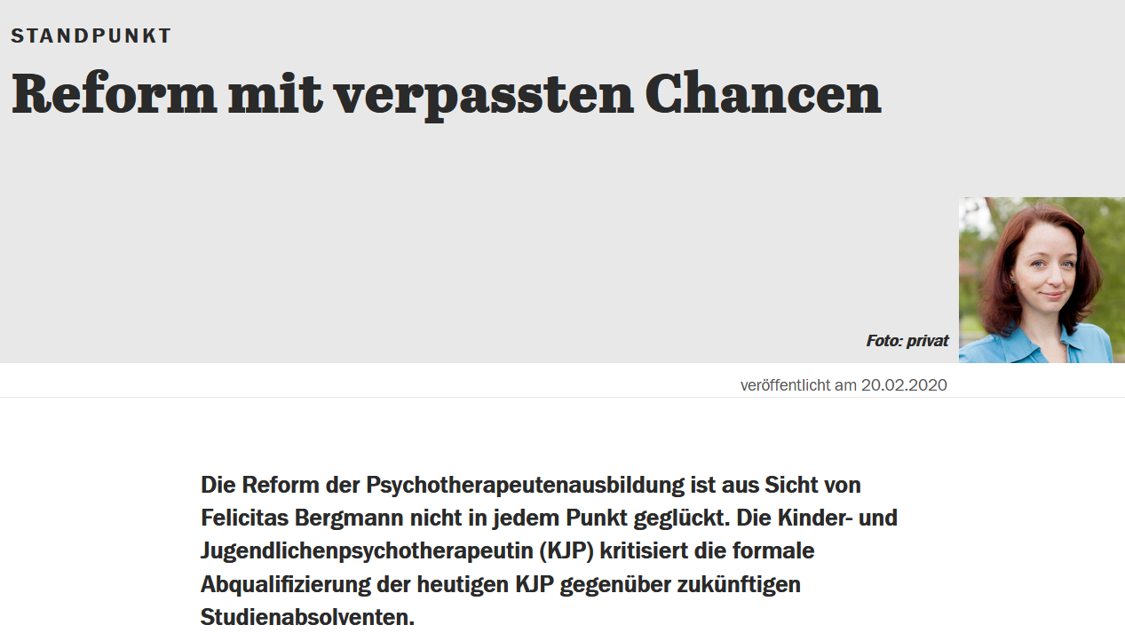 „….Auch die Kinder- und Jugendlichen-Psychotherapie wird unter dieser Psychologisierung leiden. Während es bisher auch Angehörigen pädagogischer Berufe möglich war, eine solche Therapieausbildung zu machen, wird dieser Zugang künftig entfallen, der einen bewährten praktischen Erfahrungsschatz für die Arbeit mit Kindern und Jugendlichen garantierte. Problematisch auch, dass das neue Studium kaum Praxisanteile enthält, wie sie eigentlich zur Erteilung einer Approbation nötig wären. So ist nicht einmal verbindlich vorgesehen, dass Studierende therapeutische Gespräche mit Patient_innen unter Supervision erlernen. Hier besteht dringender Nachbesserungsbedarf…..“