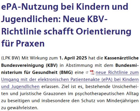 ePA bei Patient*innen unter 15 Jahren nicht befüllen, „sofern dem erhebliche therapeutische Gründe entgegenstehen“ und wenn „gewichtige Anhaltspunkte für die Gefährdung des Wohles eines Kindes oder Jugendlichen vorliegen“. Vermerk dazu in Behandlungsdokumentation verpflichtend