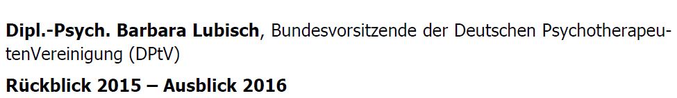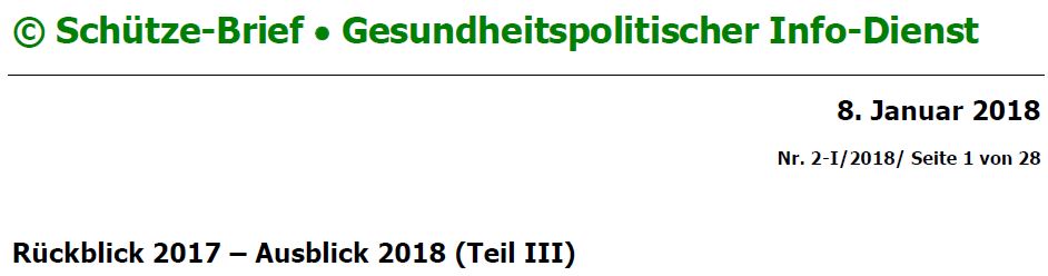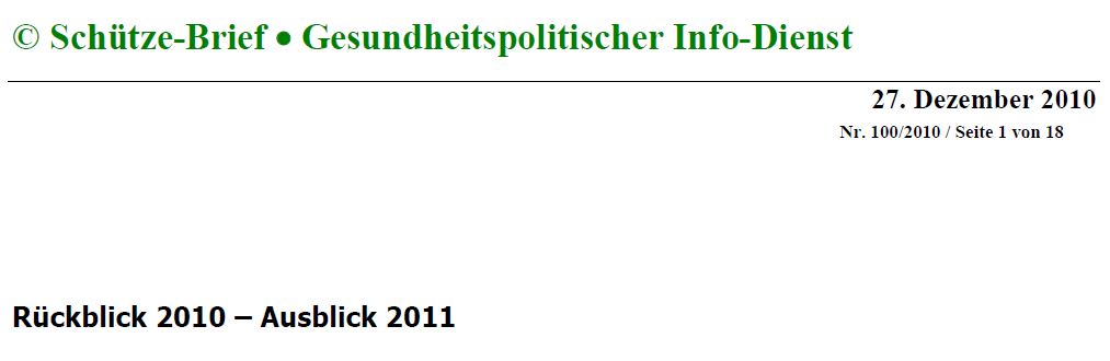 Außerdem ist für einen längeren Rückblick hilfreich, die Beiträge der DPtV im Schütze-Brief, einem gesundheitspolitischen Informationsdienst, nachzulesen – jeweils ein Jahresrückblick, was für die Psychotherapeuten wichtig war: