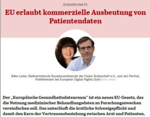 „Was sie [die Versicherten] mit Sicherheit nicht beeinflussen werden, ist, dass die Daten später in einen sogenannten Europäischen Gesundheitsdatenraum weiter gegeben werden. Hier sollen Informationen über Patientinnen und Patienten aus ganz Europa verpflichtend zusammengeführt und für die Forschung bereitgestellt werden. Dorthin werden dann auch die Daten aus Deutschlands elektronischen Patientenakten weitergeleitet. Sollte der Gesetzentwurf in Brüssel so beschlossen werden, wie er derzeit diskutiert wird, wird es für Patienten kaum möglich sein, die Kontrolle über ihre Daten zu behalten – geschweige denn zu erfahren, wer diese wofür nutzt.“